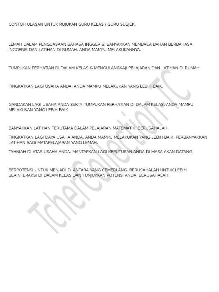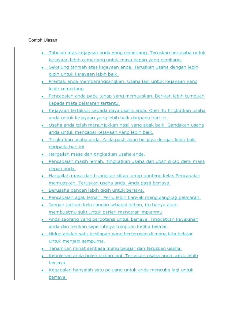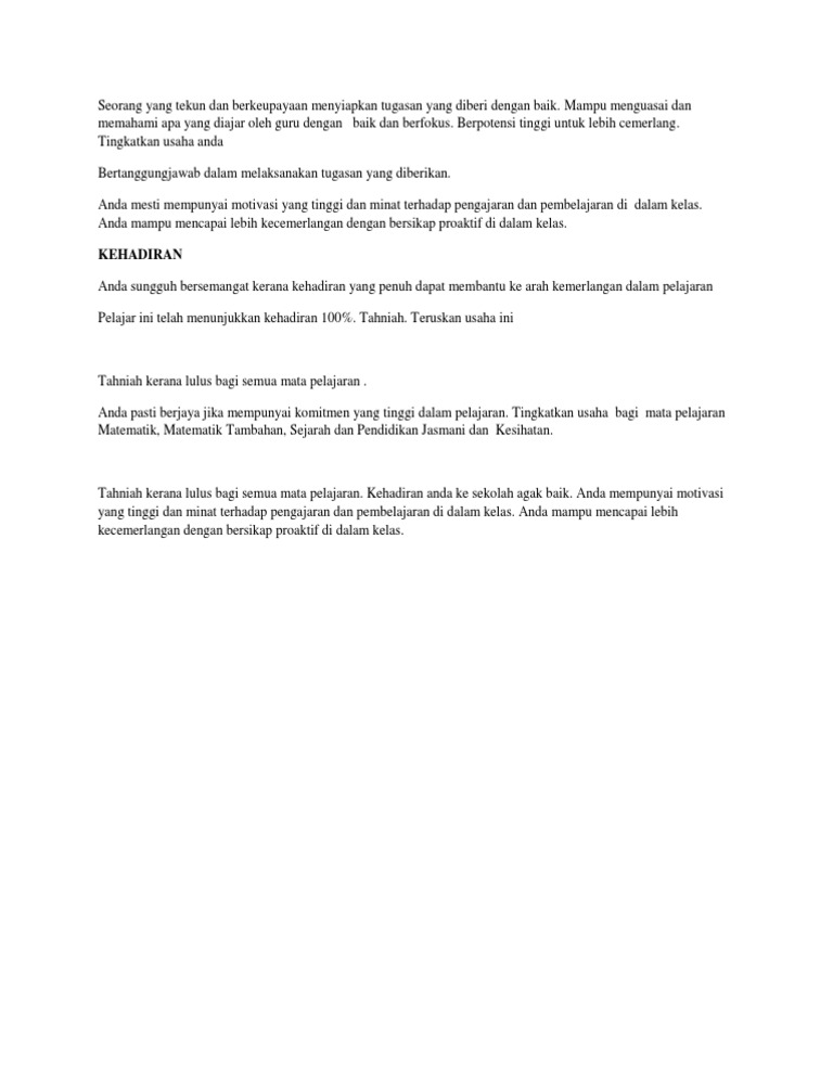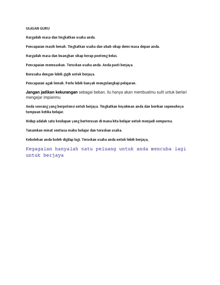 Ulasan ini terpulang kepada guru untuk menulis ayat asalkan ayat itu memberi dorongan dan semangat kepada murid. Teruskan berusaha untuk kejayaan lebih cemerlang untuk masa depan yang gemilang Sekalung tahniah atas kejayaan anda. Sebagai contoh jika anda membaca geografi pagi itu pada.