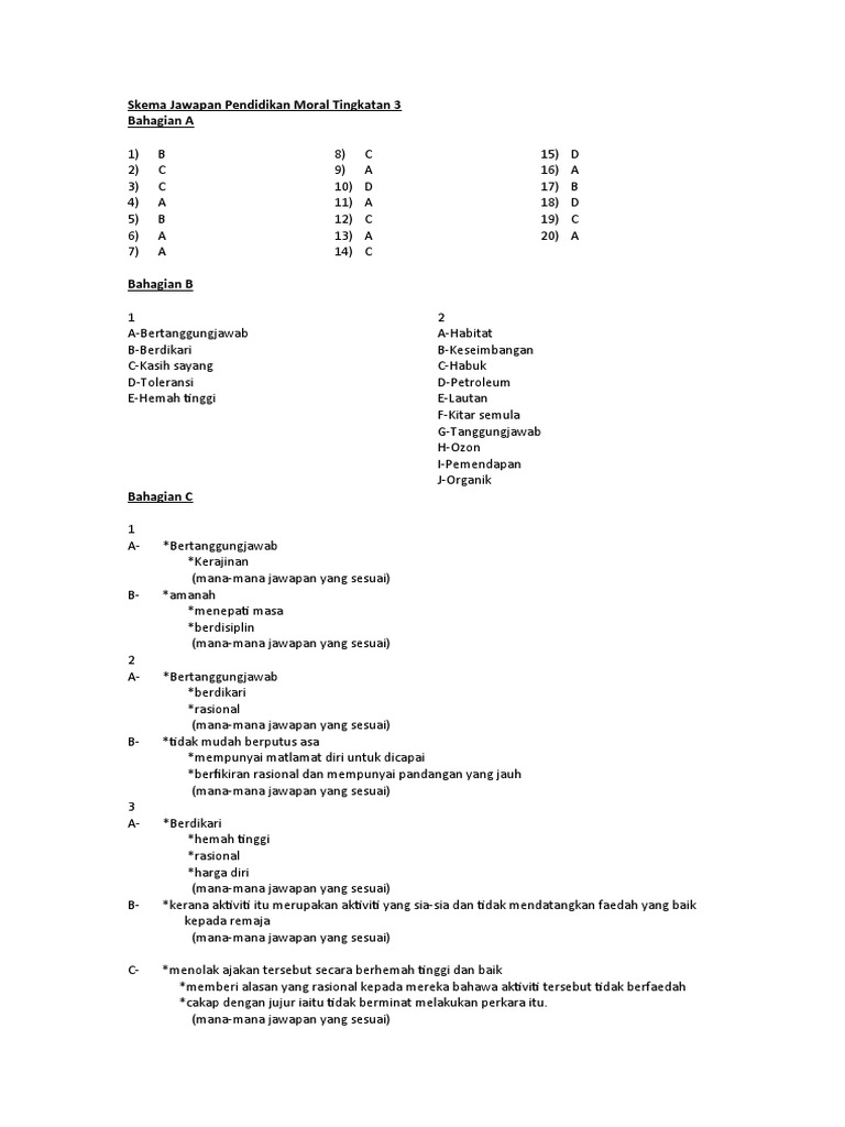 Ujian Pendidikan Moral Skema Jawapan Tingkatan 4 dan 5. View Skema Jawapan B1 -B7docx from GEOL 2 at Tunku Abdul Rahman University College Kuala Lumpur. SPM Sijil Pelajaran Malaysia.